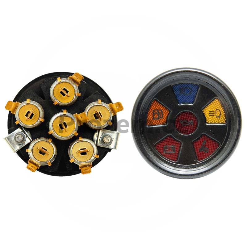 Kontrolní displej pro John Deere, Zetor. Instalace Ø 60 mm, tlakový olej, světlo, dálkové světlo, kontrola nabíjení, nádrž, ruční brzda, s plochými konektory. Katalogová čísla: PE59115623, 59115623. Vhodné pro typ John Deere: 2100, 2200, 2300, 2400. Vhodné pro typ Zetor: 3320, 3340, 4320, 4340, 5011, 5211, 5213, 5243, 5245, 5320, 5340, 6011, 6045, 6211, 6245, 6320, 6340, 7011, 7045, 7211, 7245, 7320, 7340, 7711, 7745, 8211, 8245, 9211, 9245, 10211, 10245, 11211, 11245, 12211, 12245, 14245, 16245.