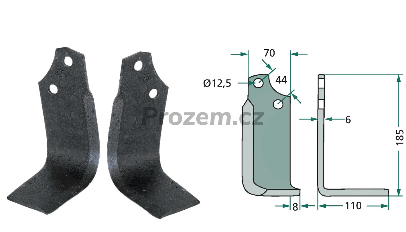 Frézovací zahnutý nůž pravý pro Maschio, M19100421R, 19100421, 44/12,5/185 mm