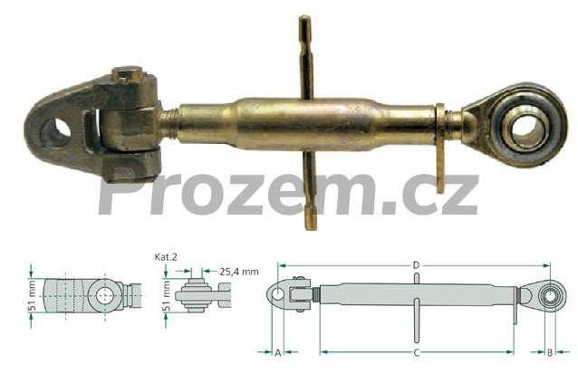 Pozinkovaný třetí bod se závitovým vřetenem M30 x 3,5mm. S vidlicovím kloubem a tvrzeným kulovým kloubem  Kat. 2-2. Standardní provedení vhodné pro traktory do 80 PS (59 kW). A- Kat.2. B- Kat.2. C=450mm (Délka dutinky). D=575mm až 835mm (Pracovní délka).