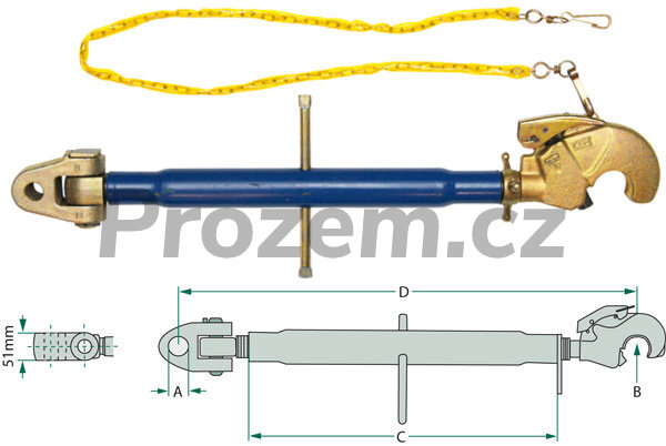 Třetí bod se záchyt. hákem a vid. M30x3,5mm (625-865mm) kat.22-2 (CBM). Pro Fendt. Pozinkovaný třetí bod se závitovým vřetenem M30 x 3,5mm. Závitové vřeteno levostranné (traktorové připojení) s hlavou vidlicového kloubu a závitové vřeteno pravostranné se záchytným hákem,  Kat. 22.25mm-2. A- Kat.22.25mm. B- Kat.2. C = 405mm (Délka dutinky). D = 625mm až 865mm (Pracovní délka).