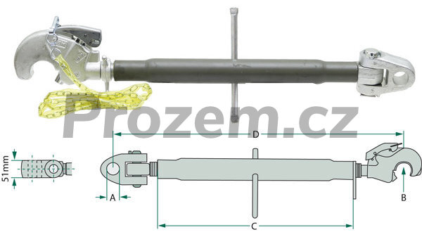 Třetí bod se záchyt. hákem a vid. M36x3mm (700-1020mm), Kat.3-3 (CBM). Pozinkovaný třetí bod se závitovým vřetenem M36 x 3mm. Závitové vřeteno levostranné (traktorové připojení) s hlavou vidlicového kloubu a závitové vřeteno pravostranné se záchytným hákem,  Kat. 3-3, A - Kat. 3. B - Kat. 3. C - 460mm (Délka dutinky). D - 700mm až 1020mm (Pracovní délka).